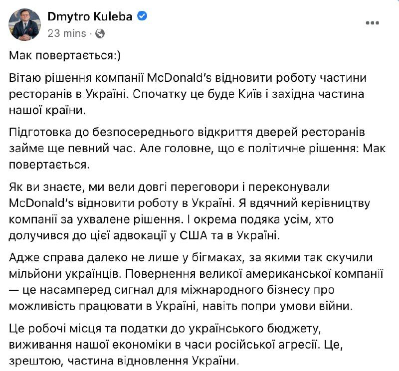 Дмитрий Кулеба, министр иностранных дел Украины, также подтвердил, что McDonald’s возвращается в Украину.