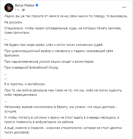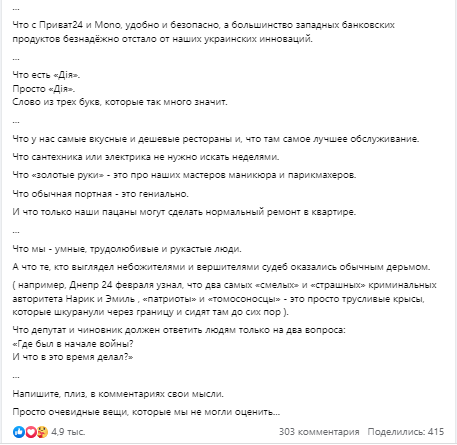 Война раскрыла нам глаза на то, что мы либо не могли оценить, либо переоценивали. Например, выехав в Европу, мы узнали, что наши доктора - лучшие. И чтобы попасть с соплями к врачу, не стоит ждать в очереди месяцами, а просто позвонить в амбулаторию на районе. А ещё, именно в Украине - классная стоматология, которая не стоит десятки тысяч долларов. Что с Приват24 и Mono удобно и безопасно, а большинство западных банковских продуктов безнадёжно отстало от наших украинских инноваций. Что есть «Дія». Просто «Дія». Слово из трех букв, которые так много значат. Что у нас самые вкусные и дешевые рестораны и что там самое лучшее обслуживание. Что сантехника или электрика не нужно искать неделями. Что «золотые руки» - это про наших мастеров маникюра и парикмахеров. Что обычная портная - это гениально. И что только наши пацаны могут сделать нормальный ремонт в квартире. Что мы - умные, трудолюбивые и рукастые люди, - написал мэр Днепра.