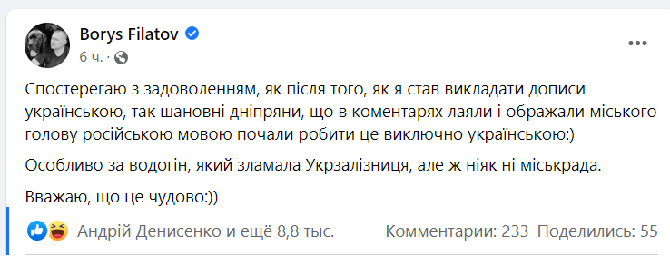 Наблюдаю с удовольствием, как после того, как я стал публиковать сообщения на украинском, уважаемые днепряне, которые в комментариях ругали и оскорбляли городского голову на русском языке, начали делать это исключительно на украинском, - пошутил Борис Филатов.