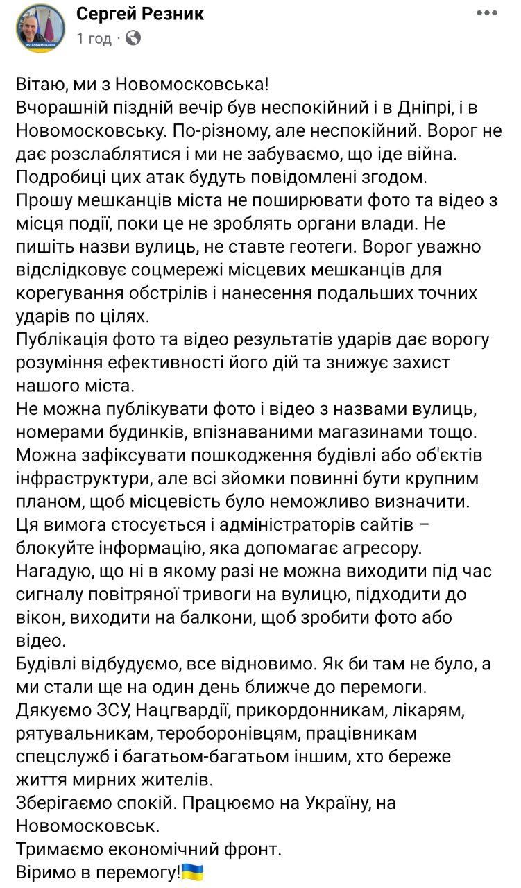 Вчера в Новомосковске жители слышали взрыв. Сергей Резник рассказал, какая ситуация в городе по состоянию на утро 31 марта.
