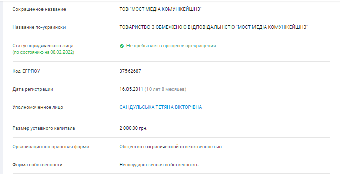 Компания была зарегистрирована в 2011 году. В настоящее время ее учредителем выступает Вилен Анисимов из Павлограда, а руководителем – Татьяна Сандульская.