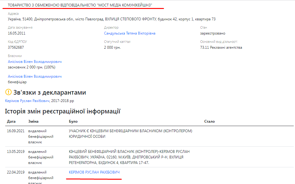 До мая 2019 года одним из соучредителей «Мост медиа комуникейшинз» выступал Руслан Керимов.
