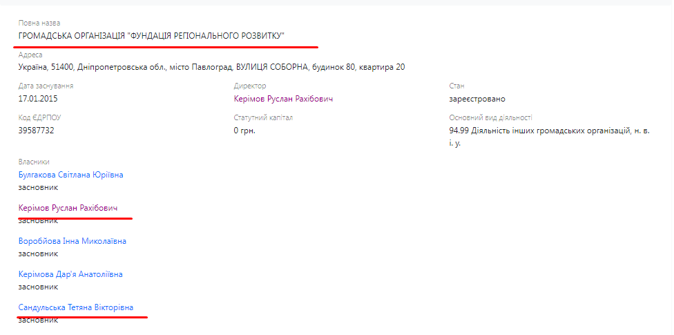В налоговой декларации за 2020 год Керимов указал, что состоит в ОО «Фундация регионального развития». В этой же общественной организации состоит руководить «Мост медиа комуникейшинз» Татьяна Сандульская.