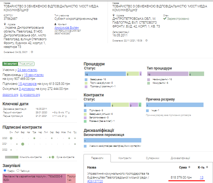 Так что «Мост медиа комуникейшинз» не чужая компания от Павлоградского городского совета, его исполнительных органов и коммунальных предприятий. За это компания регулярно получает подряды от бюджетных организаций. Одно только управление коммунального хозяйства и строительства заключило с ООО договоров на общую сумму свыше 800 тысяч гривен.