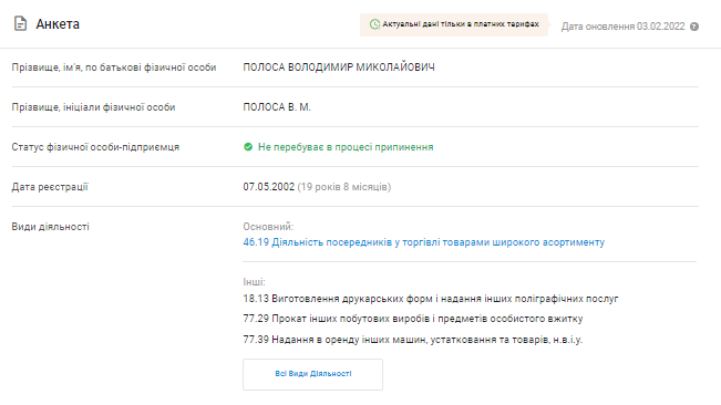 Как ФЛП Владимир Полоса зарегистрировался еще в 2002 году. Основной вид его деятельности – деятельность посредников в торговле товарами широкого ассортимента.