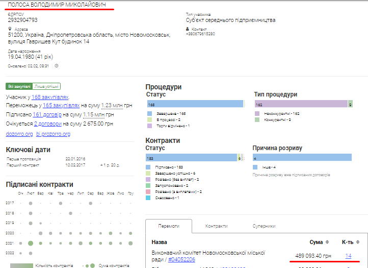 Владимира Полосу в мэрии Резника любят. Поэтому предприниматель регулярно получает подряды от исполнительных органов и коммунальных предприятия Новомосковского городского совета.