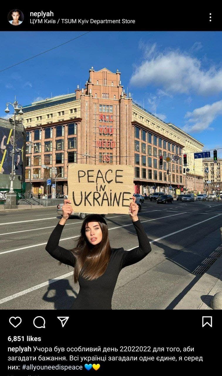 Девушка использовала надпись на киевском ЦУМе, чтобы выразить свою поддержку Украине. Она сфотографировалась на фоне надписи на здании ЦУМа: «All you need is ...», добавив к ней «...peace in Ukraine». «Все, что тебе нужно это мир в Украине» - гласила фотография.