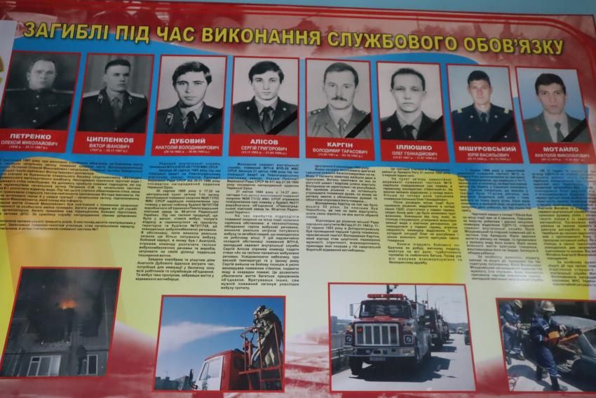 На стенде с фотографиями героев ГСЧС написаны истории погибших спасателей. Многие из них пожертвовали жизнями ради спасения коллеги или потерпевшего. Например, мужчина на фотографии, пятый слева, погиб в огне. Вместе с товарищем он оказался на верхнем этаже здания, заблокированного пламенем. По пожарному рукаву на спасительную землю мог спуститься только один, и Владимир решил отдать жизнь товарищу — он до последнего держал рукав, по которому тот спустился на землю. Перед тем, как принять такое решение Владимир сказал товарищу «У меня один ребенок, а у меня двое — спускайся».