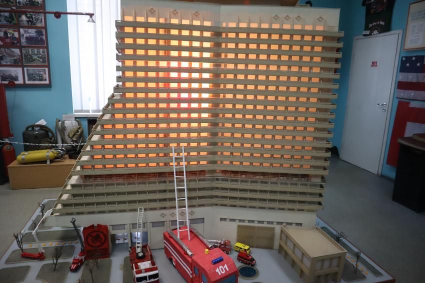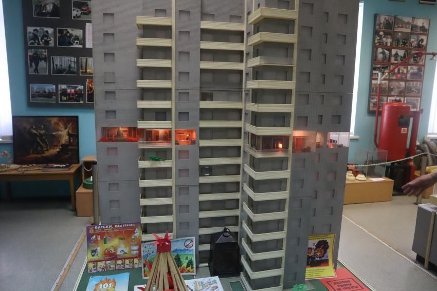 На макете другого здания (тоже высотой в человеческий рост) наглядно показаны самые частые причины пожаров. Там размещены даже самые мелкие детали интерьера в квартире: