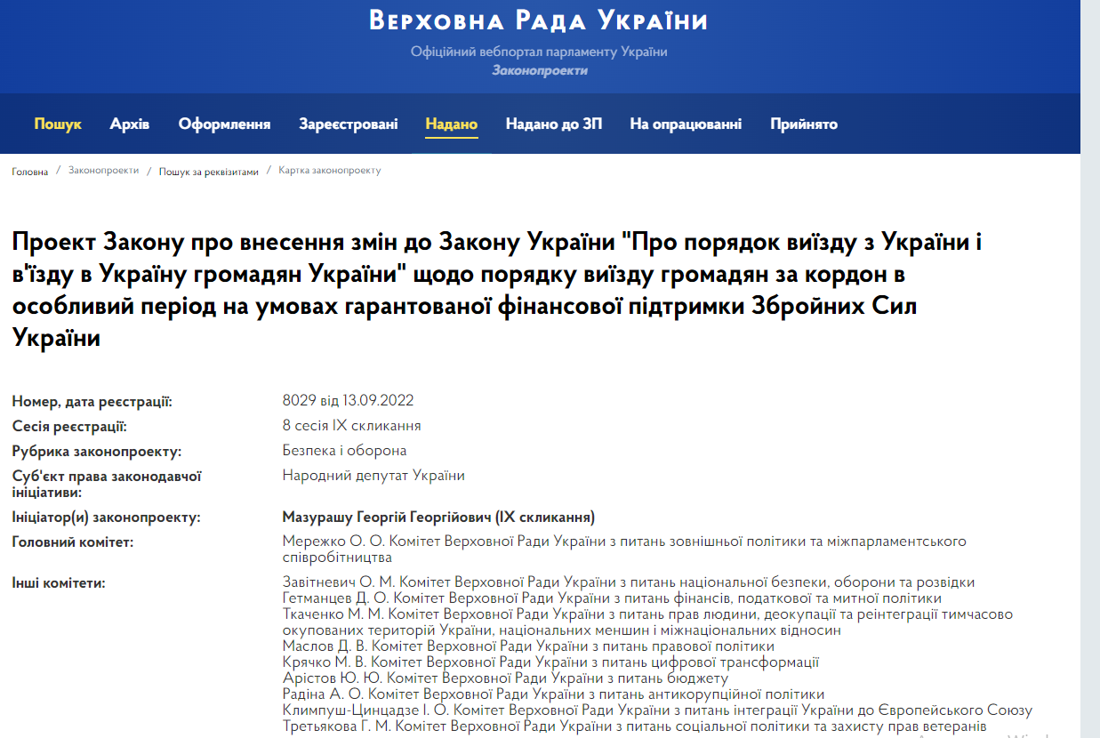На сайте Верховной Рады зарегистрировали законопроект, авторы которого предлагают разрешить военнообязанным мужчинам выезд за границу под ежемесячный взнос на специальный счет ВСУ.