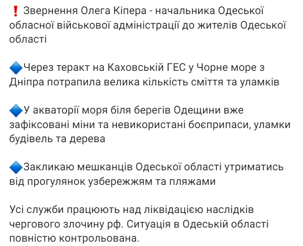 "В связи с этим обращаюсь с просьбой к жителям Одесской области: удерживайтесь от нахождения на побережье моря, в том числе пляжах, до завершения работ по ликвидации последствий. Уверяю, ситуация контролируемая", - отметил Кипер.