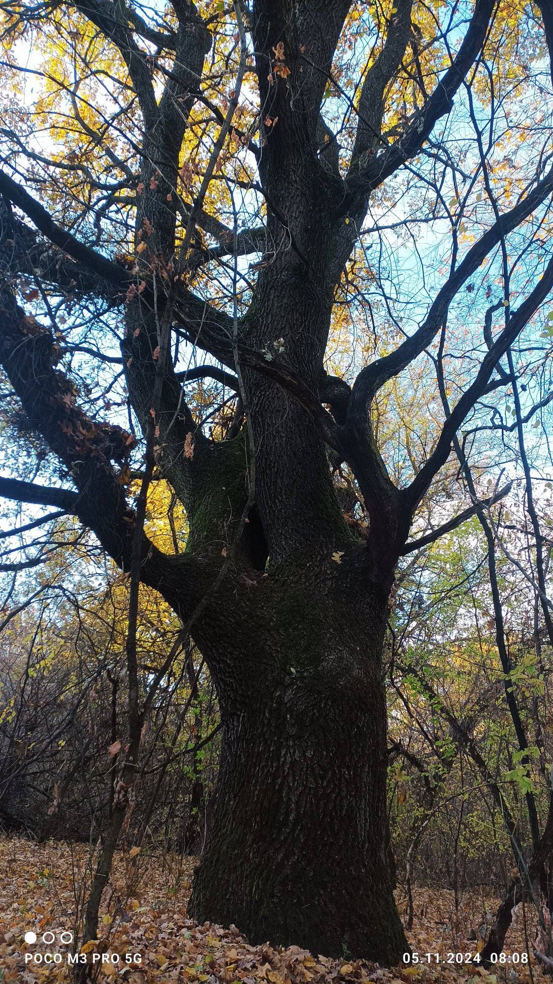 Возле заросшей деревьями лесной дороги растет коренастый дуб-великан, объятия ствола которого более трех метров Днепропетровщина. Среднее поорель.06.11.2024г, - пишет Александр.
