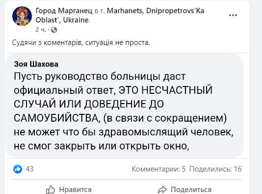 В соцсети жители Марганца скорбят из-за гибели известного в городе акушера-гинеколога. По официально неподтвержденным данным, врач выпала из окна больницы. В комментариях жители начали выражать сочувствие семье и коллегам погибшей. Они также говорят, что погибшая была прекрасным специалистом и не могут поверить в ее смерть.
