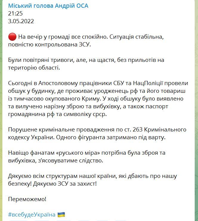 По словам мэра, в Апостолово сотрудники СБУ и Нацполиции провели обыск в доме, где проживает уроженец рф и его товарищ со временно оккупированного Крыма. В доме нашли взрывчатку, оружие, символику СССР и российский паспорт.