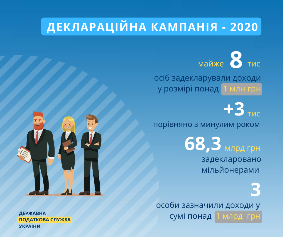 Несмотря на кризис, связанный с эпидемией коронавируса, количество граждан Украины, которые обозначили свой доход в 2020 году цифрой более 1 миллиона гривен, по сравнению с прошлым годом, выросло на 3 000 человек.