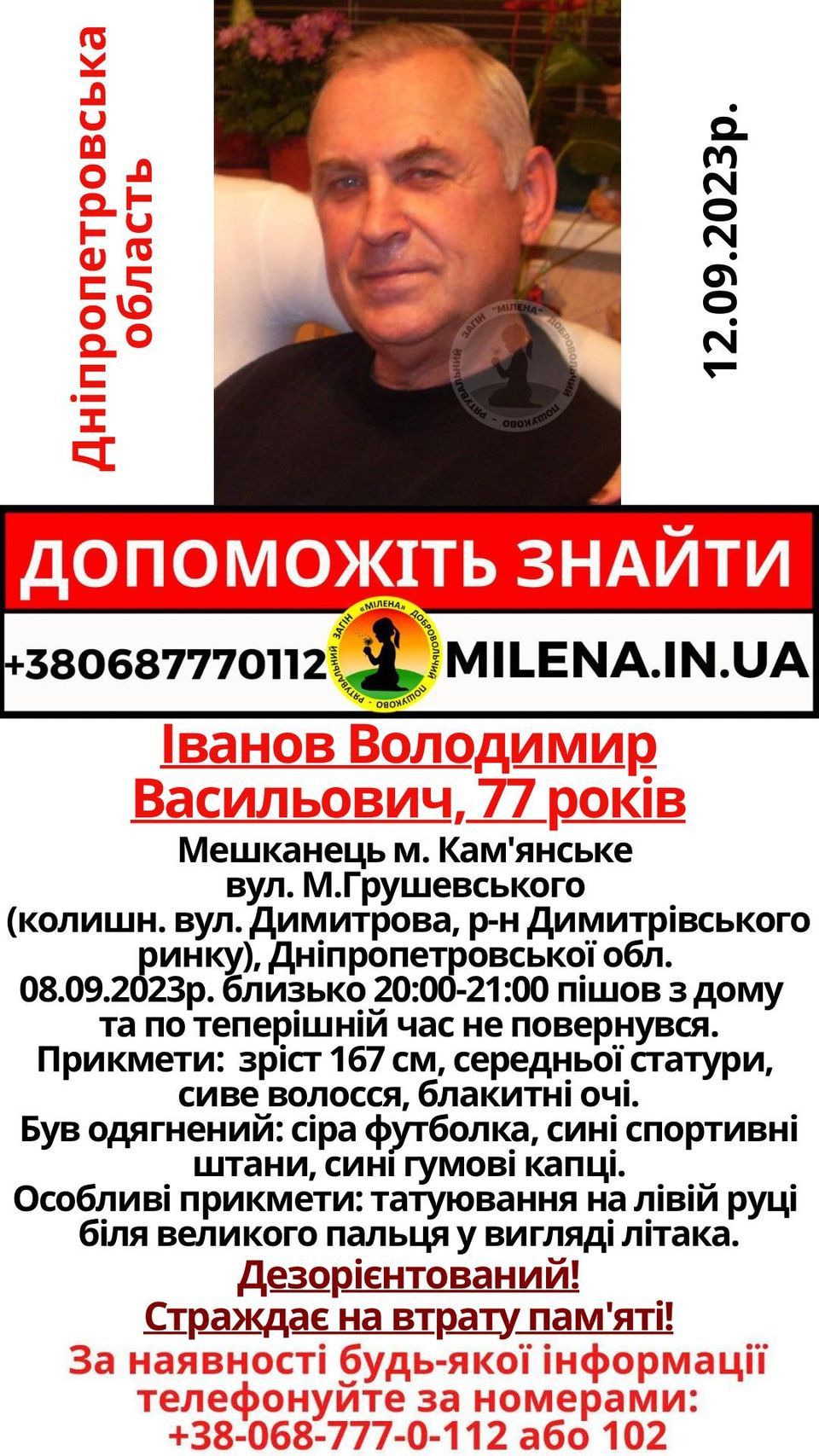 Известно, что 8 сентября около 20:00-21:00 пенсионер ушел из дома по ул. Грушевского в Каменском и до сих пор не вернулся.