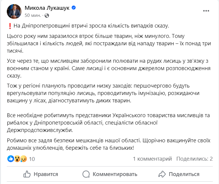 Поэтому в регионе планируют проводить ряд мероприятий: в первую очередь будут регулировать популяцию лис, проводить иммунизацию, разбрасывая вакцину в лесах, диагностировать диких животных. Делаем все для безопасности жителей нашей области. Ежегодно вакцинируйте своих домашних питомцев, берегите себя и близких! – написал Лукашук.