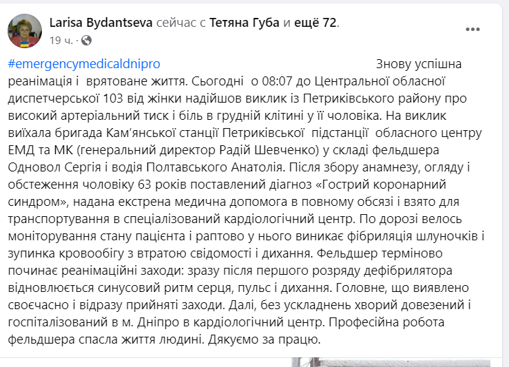 Фельдшер срочно приступил к реанимационным мероприятиям: после первого разряда дефибриллятора восстановились синусовый ритм сердца, пульс и дыхание. Далее без осложнений больного доставили в кардиологический центр в Днепре. Профессиональная работа фельдшера спасла жизнь человеку, – добавила Лариса Быданцева.