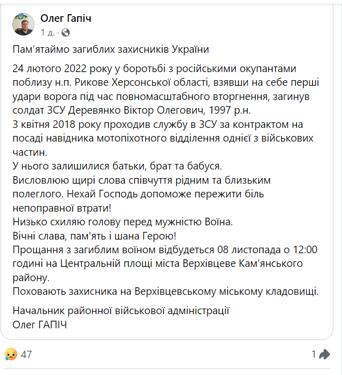 Выражаем искренние соболезнования родным и близким павшего защитника.