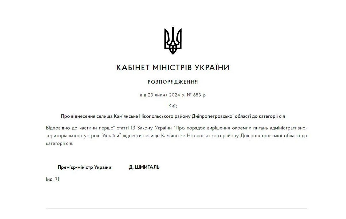 «Именно из-за уменьшения численности населения, согласно Закону Украины "О порядке решения отдельных вопросов административно-территориального устройства Украины", который вступил в силу 26 января 2024 года и принят Верховной Радой Украины в июле прошлого года и подписан Президентом Украины в октябре, регулирующим административно- территориальное устройство страны – поселок Каменское теперь изменено в село Каменское», уточнили в сообщении.