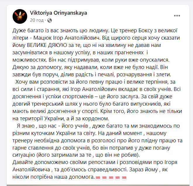 Очень многие из вас знают этого человека. Это тренер по боксу с большой буквы – Мацюк Игорь Анатольевич. Я знаю, что нас – его учеников – очень много, и мы находимся по разным уголкам Украины и мира. Сейчас нашему тренеру необходима помощь в огласке его плодотворной работы и хорошего отношения к своим ученикам, потому что он попал в очень плохую ситуацию (его задержали за то, чего он не делал). Давайте поможем и добьемся справедливости. Сейчас ему как никогда нужна наша помощь, – написала женщина.