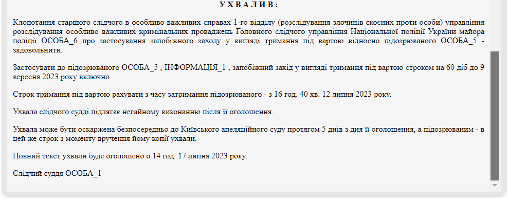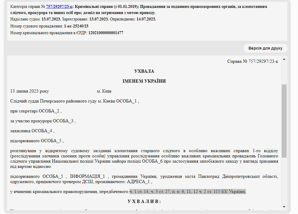 Отметим, в Едином реестре судебных решений Украины уже размещено постановление Печерского районного суда Киева о взятии тренера ДСШ из Павлограда (имя скрыто) на 2 месяца под стражу – с 12 июля по 9 сентября включительно.