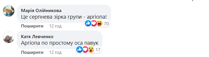 Отметим, аргиопа – это яркий паук из семьи коллопрядов, с полосатым желто-черно-белым брюшком. Распространен в умеренном и субтропическом поясах Палеарктики, в частности, в Украине. Питается маленькими прямокрылыми, другими насекомыми.