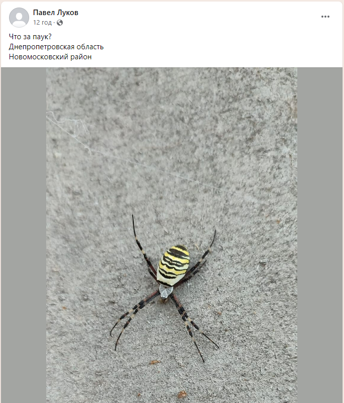 В комментариях под постом сразу сообщили, что это – аргиопа или паук-оса.