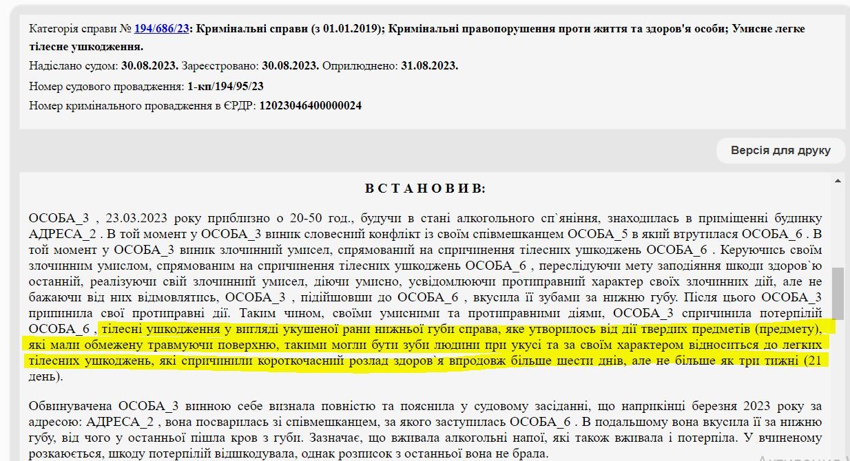Позже пострадавшая обратилась в суд. Во время заседания вину женщины доказали, ведь она нанесла легкие телесные повреждения в виде укушенной справа нижней губы.
