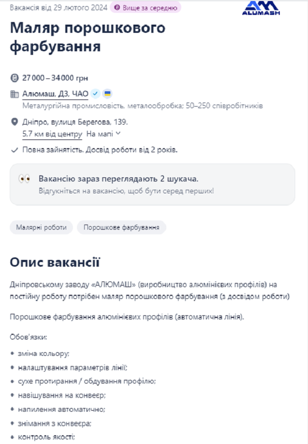 Маляр, знающий что такое порошковая покраска и умеющий с ней работать может заработать от 27 до 34 тыс грн в месяц. Работнику нужно будет красить алюминиевые профили. Среди обязанностей: изменение цвета, настройка параметров линии, сухое протирание и обдувание профиля, навешивание его на конвейер, контроль качества и уборка участка.