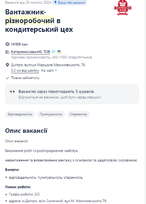 Грузчик на кондитерской фабрике в Днепре может заработать 14,9 тыс грн. От соискателя требуется ответственность, пунктуальность и старание во время работы. Работать нужно будет по графику 2/2.
