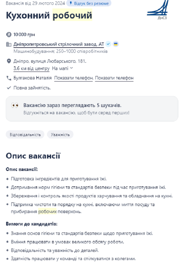 На один из заводов Днепра требуется работник, который будет заниматься кухней. Готовить не нужно будет. Все, что от него требуется это подготовка ингредиентов для повара. Также необходимо будет соблюдать нормы санитарной гигиены во время работы, контролировать качество и годность продуктов, рабочее состояния оборудования на кухне. Помимо этого нужно будет мыть посуду и убирать рабочие поверхности после приготовления пищи. От будущего сотрудника требуется знание основ гигиены и стандартов безопасности касательно приготовления еды, умение работать с большими объемами продуктов, внимательность. Работать нужно будет с 7:00 до 15:45. Платить обещают 10 тыс грн.