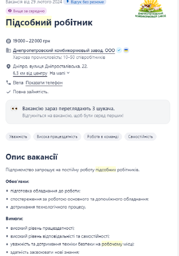 Подсобный рабочий на комбикормовом заводе может зарабывать от 19 до 22 тыс грн в месяц. В его обязанности будет входить подготовка оборудования к работе, поддержка технического процесса. От соискателя требуется быть трудоспособным, уметь работать в коллективе, постоянно обучаться и развиваться, придерживаться правил безопасности на рабочем месте.