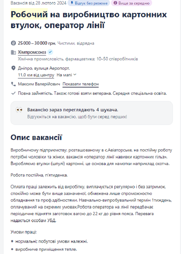 Оператор линии по производству картонных втулок может зарабатывать в Днепре от 25 до 30 тыс грн в месяц. Само предприятие занимается производством втулок для намотки. Оплата труда зависит от выработки. Но для этой работы нужно быть физически сильным человеком – иногда нужно будет поднять вес до 22 кг.
