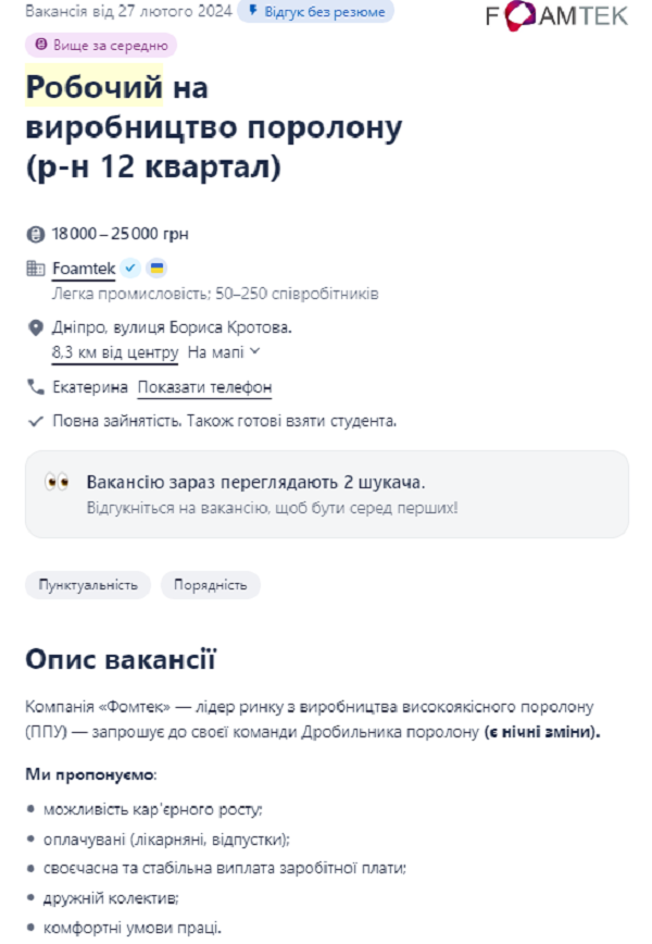 Дробильщик поролона на производстве может зарабатывать от 18 до 25 тыс грн. От соискателя требуется быть порядочным, пунктуальным, хотеть работать и не курить во время рабочего дня.