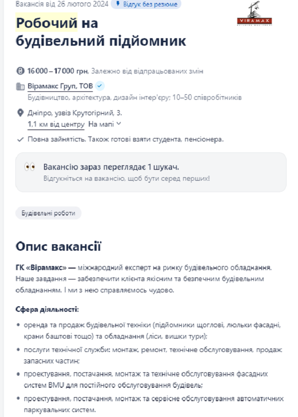 Рабочий, который будет трудиться на строительном подъемнике может заработать в месяц от 16 до 17 тыс грн. Все зависит от количества отработанных смен. В обязанности работника будет входить: управление строительным подъемником. Также нужно будет следить за его исправностью и чистотой.