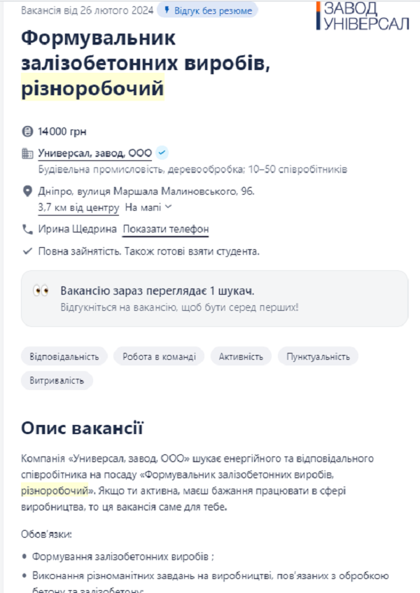 Формовщик железобетонных изделий в Днепре может заработать 14 тыс грн в месяц. В его обязанности будет входить не только формирование железобетонных издений, но и поддержание чистоты и порядка на рабочем месте. Основные требования к будущему сотруднику: ответственность и пунктуальность, готовность выполнять рутинную работу, умение работать в команде.