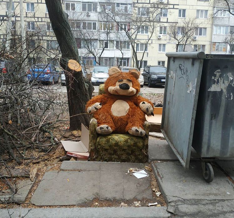 Во дворе возле одной из многоэтажек на жилом массиве Левобережный-3 создали самую уютную свалку в Днепре. Все началось со старого кресла, выброшенного кем-то из местных жителей. Впоследствии кто-то принес и посадил сюда старого огромного плюшевого медведя.