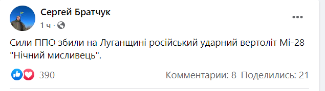 "Силы ПВО сбили на Луганщине российский ударный вертолет Ми-28 «Ночной охотник», - написал он.
