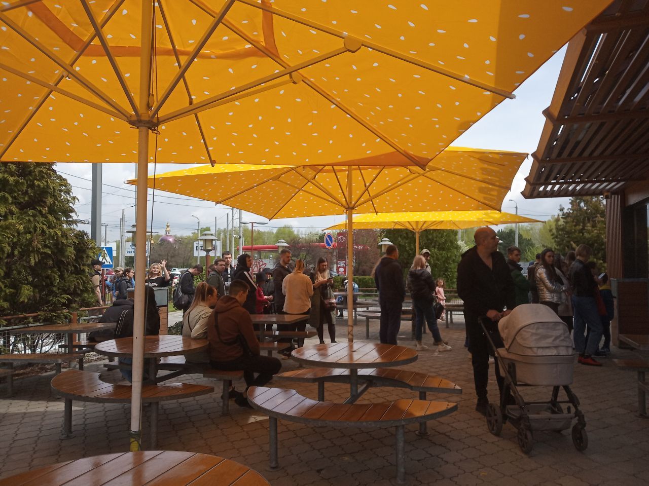 McDonald’s открылся в Днепре 25 апреля. С самого утра около заведения толпились покупатели. Желающих купить фаст-фуд было так много, что администрация заведения приняла решение пускать в ресторан ограниченное количество людей – по 2-3 человека. Остальные вынуждены были толпиться на улице, среди столиков с зонтиками – тут очередь из посетителей растянулась на 100 метров от входа.