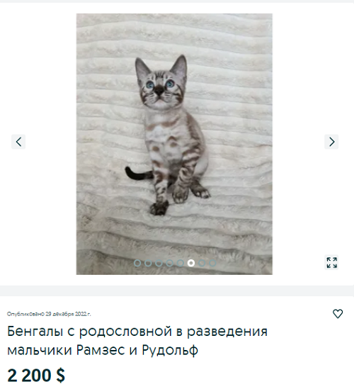 Бенгальская кошка с родословной обойдется в 81 тыс грн. У такого котенка есть пакет документов, паспорт, прививки, он знает, что такое лоток и когтеточка. Родители усатого породистые и титулованные, по крайней мере так заявляет заводчик. Новый хозяин потом также может заняться разведением маленьких бенгалов.