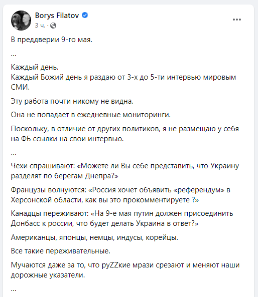 Он написал, что каждый день дает интервью мировым СМИ. Журналистов очень интересует мнение мэра Днепра по поводу того, что хотят делать оккупанты на украинской земле.
