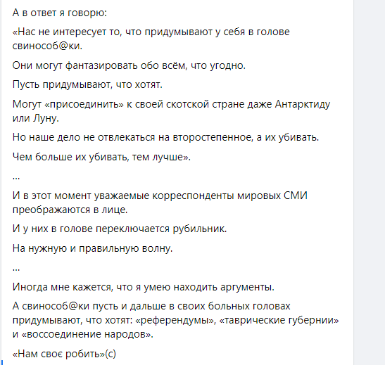 И в этот момент уважаемые корреспонденты мировых СМИ преображаются в лице. И у них в голове переключается рубильник. На нужную и правильную волну. Иногда мне кажется, что я умею находить аргументы. А свинособ@ки пусть и дальше в своих больных головах придумывают, что хотят: «референдумы», «таврические губернии» и «воссоединение народов».