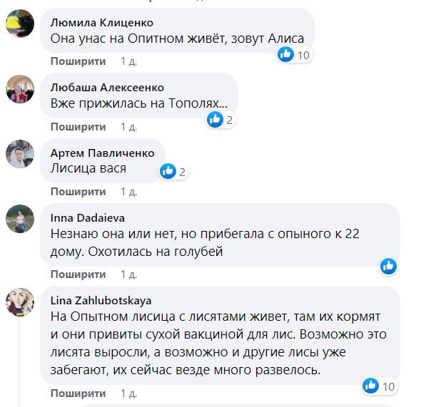 В комментариях днепряне отметили, что тоже видели эту лису рядом с домами. Животное не в первый раз прибегает на территорию жилмассива. Местные говорят, что однажды видели, как она охотилась за голубями.