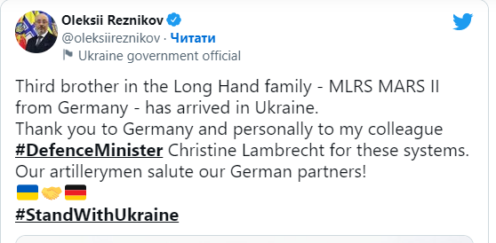 До України прибув третій брат з Long Hand родини – РСЗВ Mars II з Німеччини. Дякую Німеччині та особисто моїй колезі, міністерці оборони Крістіні Ламбрехт за ці системи. Наші артилеристи дякують німецьким партнерам, – написав він.