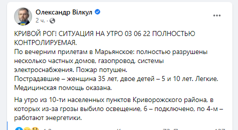 "По вечерним прилетам в Марьянское: полностью разрушены несколько частных домов, газопровод, системы электроснабжения. Пожар потушен. Пострадавшие – женщина 35 лет, двое детей – 5 и 10 лет. Легкие. Медицинская помощь оказана", - написал Александр Вилкул.