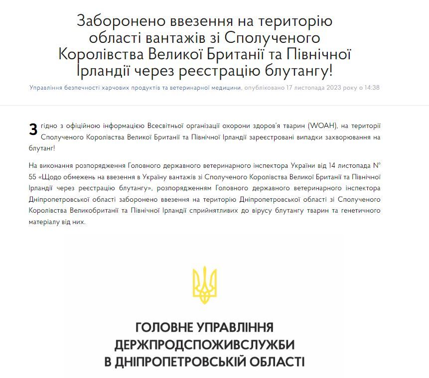 В связи с фиксацией в Великобритании нескольких очагов заболеваемости крупного рогатого скота блутангом, некоторые грузы нельзя ввозить на территорию Украины и в частности Днепропетровщины.
