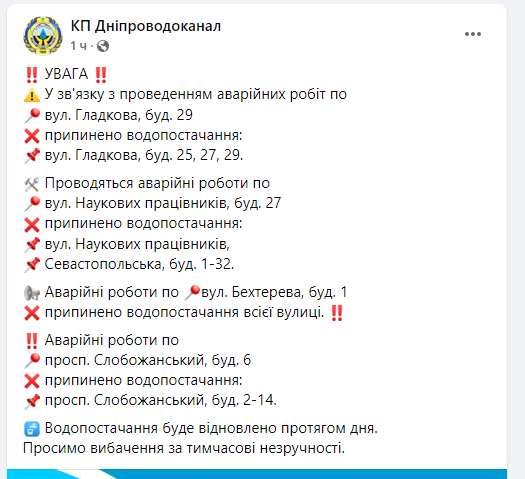 Так, в связи с проведением аварийных работ на ул. Гладкова, 29; ул. Научных работников, 27; ул. Бехтерева, 1; просп. Слобожанском, 6 прекращено водоснабжение: