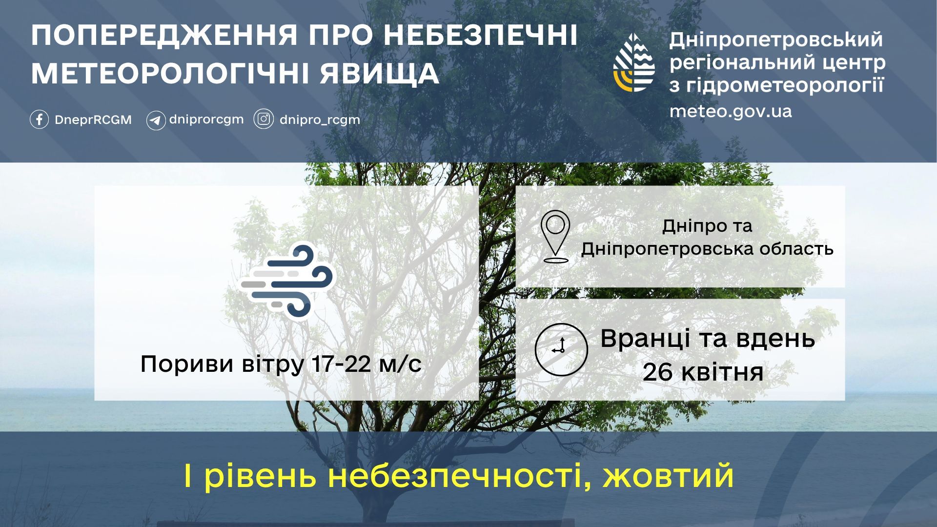Как сообщают в Днепровском гидрометцентре, завтра, 26 апреля утром и днем в Днепре и Днепропетровской области ожидаются порывы западного ветра 17-22 м/с.