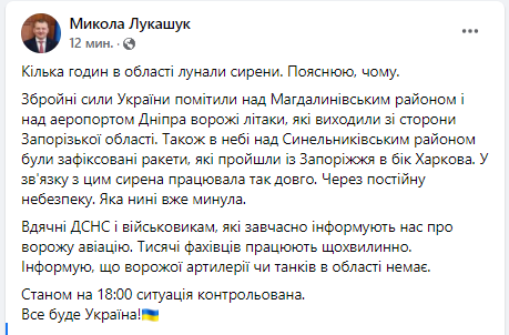 По его словам, Вооруженные силы Украины заметили над Магдалиновским районом и аэропортом Днепра вражеские самолеты, которые летели из Запорожской области. Также в небе над Синельниковским районом были зафиксированы ракеты, пролетевшие из Запорожья в сторону Харькова. Поэтому сирена работала так долго.